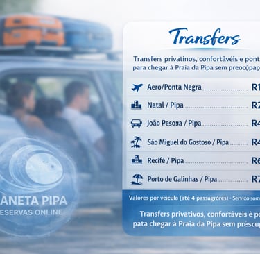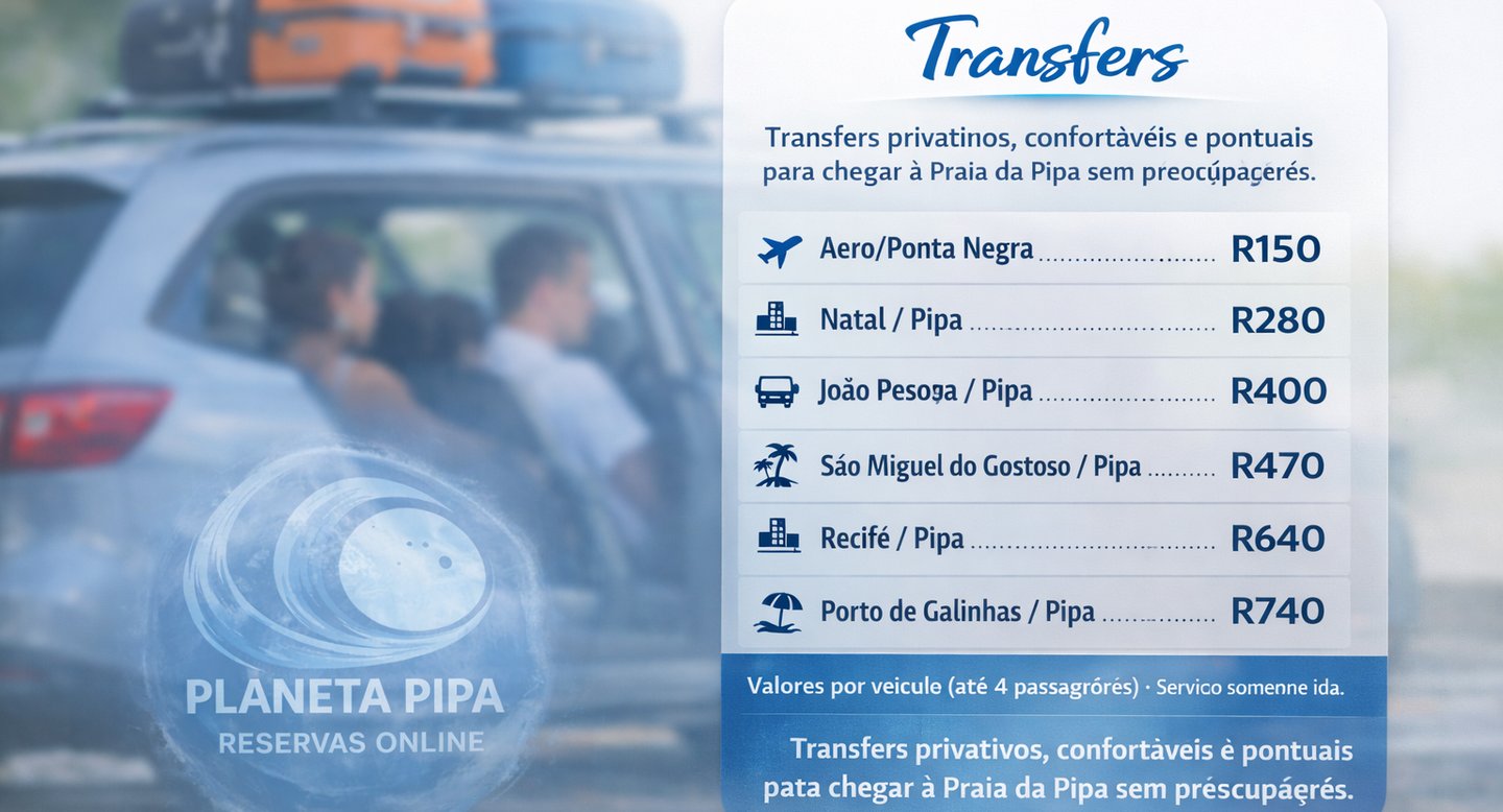 O serviço inclui transporte privativo, com motorista profissional, do local de origem até a Praia da Pipa ou viceversa , com conforto e segurança.